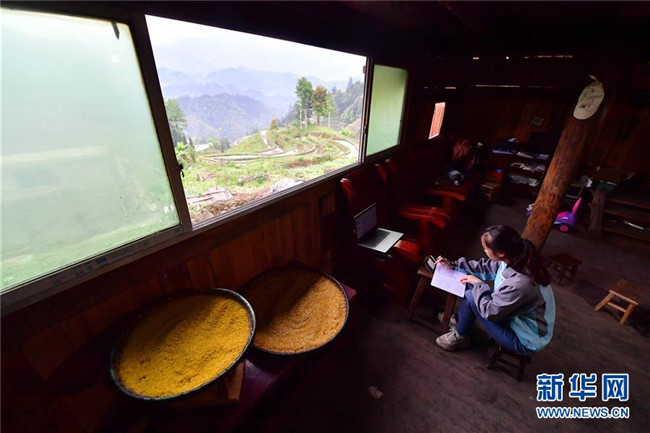 在廣西融水苗族自治縣桿洞鄉(xiāng)黨鳩村,就讀于廣西科技師范學院的梁孟香在家里上網課(4月9日攝)。新華社記者 黃孝邦 攝