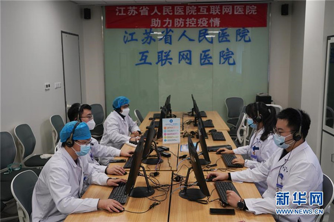 在江蘇省人民醫(yī)院互聯(lián)網醫(yī)院辦公室,醫(yī)生和信息處的工作人員在工作(2月7日攝)。新華社記者 季春鵬 攝