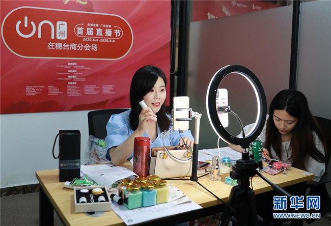 6月6日,廣州啟動“首屆直播節(jié)”活動,這是主播在廣州市白云區(qū)臺商分會場直播帶貨。新華社記者 盧燁 攝
