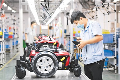 近來,江西省豐城市外貿(mào)企業(yè)通過與電商平臺合作、云推介等方式促進(jìn)企業(yè)穩(wěn)產(chǎn)增效。圖為豐城市捷和電機(jī)(江西)有限公司員工在生產(chǎn)線上組裝電動輪椅車,準(zhǔn)備出口至歐洲、中東、非洲等地市場。周 亮攝(人民視覺)