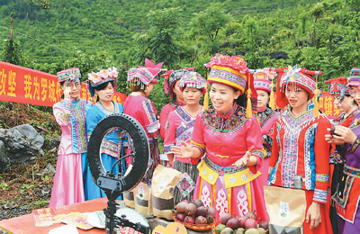 7月11日,廣西羅城仫佬族自治縣“仫佬十姐妹”直播團(tuán)隊(duì)在四把鎮(zhèn)集環(huán)村介紹當(dāng)?shù)剞r(nóng)特產(chǎn)品,通過電商直播“帶貨”,助力脫貧攻堅(jiān)。韋如代攝(人民視覺)