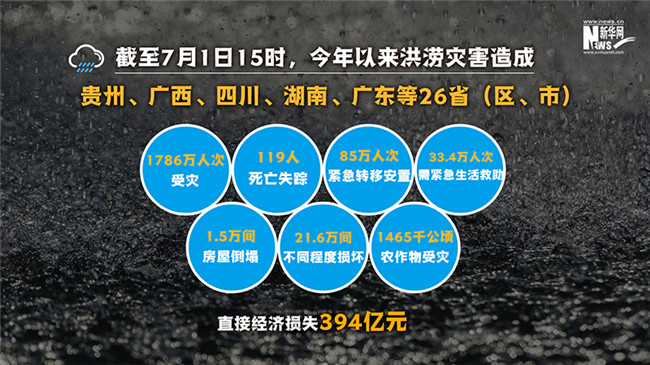 今年汛情帶來(lái)的破壞力有多強(qiáng)?張家團(tuán)告訴記者,截至7月1日15時(shí),今年以來(lái)洪澇災(zāi)害造成貴州、廣西、四川、湖南、廣東等26?。▍^(qū)、市)1786萬(wàn)人次受災(zāi),119人死亡失蹤,85萬(wàn)人次緊急轉(zhuǎn)移安置,33.4萬(wàn)人次需緊急生活救助;1.5萬(wàn)間房屋倒塌,21.6萬(wàn)間不同程度損壞;農(nóng)作物受災(zāi)面積1465千公頃,其中絕收150千公頃;直接經(jīng)濟(jì)損失394億元。
