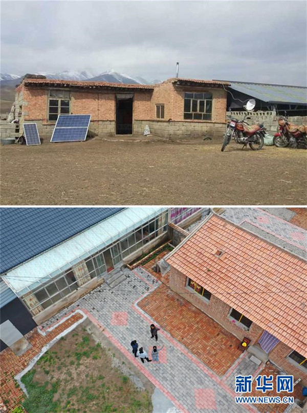 拼版照片:上圖為崗岔村村民才讓扎西在易地扶貧搬遷之前居住的房子(資料照片)。下圖為才讓扎西易地扶貧搬遷后的新家(7月23日攝,無人機照片)。新華社發(fā)(杜哲宇攝)崗岔村是甘肅省甘南藏族自治州夏河縣??奇?zhèn)的一個牧業(yè)村,平均海拔3000米以上。2018年,在夏河縣文明辦工作的卓瑪吉開始擔(dān)任駐村幫扶工作隊隊長,每年都有200多天待在草原上。兩年來,卓瑪吉帶領(lǐng)大家開辦扶貧車間,發(fā)展特色產(chǎn)業(yè),聯(lián)系勞務(wù)輸出。為了讓村民更全面地了解精準(zhǔn)扶貧政策,卓瑪吉登門宣講政策。為了提高村容村貌,卓瑪吉發(fā)動大家開展廁所革命和庭院環(huán)境評比,積極響應(yīng)甘南藏族自治州“全域無垃圾”創(chuàng)建行動。她還從縣城請來醫(yī)生,為村民舉辦健康講座,在全村婦女中開展“兩癌篩查”。如今,崗岔村變成了干凈、整齊、富裕、美麗的生態(tài)文明村,提前實現(xiàn)了整村脫貧。談起心愿,卓瑪吉說:“要讓草原和草原上的人都變得更美。”新華社發(fā)