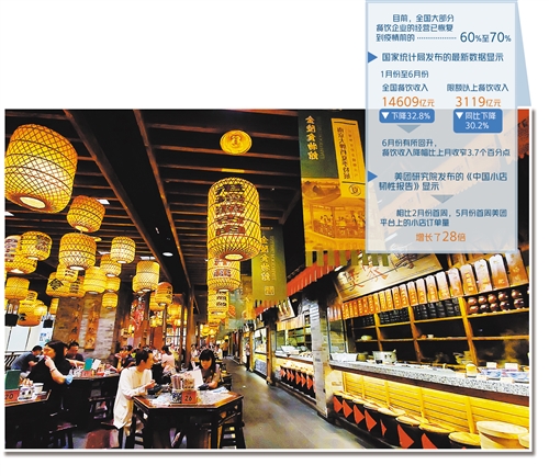 相比北京,全國(guó)其他地區(qū)餐飲行業(yè)回暖跡象要明顯得多。國(guó)家統(tǒng)計(jì)局發(fā)布的最新數(shù)據(jù)顯示,1月份至6月份,全國(guó)餐飲收入14609億元,下降32.8%;限額以上餐飲收入3119億元,同比下降30.2%。6月份有所回升,餐飲收入降幅比上月收窄3.7個(gè)百分點(diǎn),大部分店面已恢復(fù)到疫情前的六七成水平,特別是端午節(jié)小長(zhǎng)假以后,一些店鋪人氣頗高。