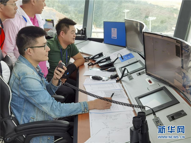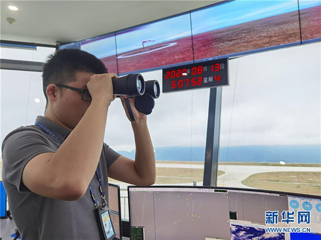 8月13日,參加校飛的地面工作人員在仙女山機(jī)場(chǎng)的塔臺(tái)工作區(qū)內(nèi)工作。 新華社記者 劉潺 攝