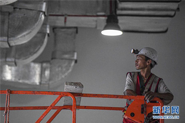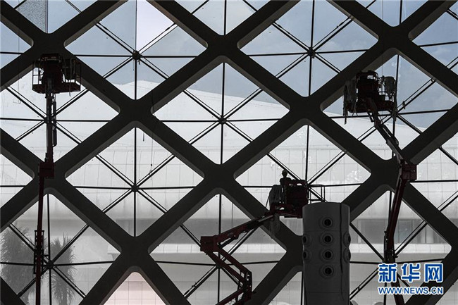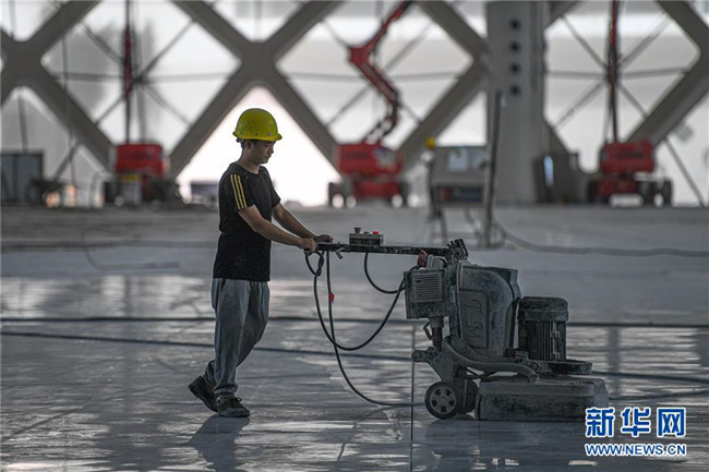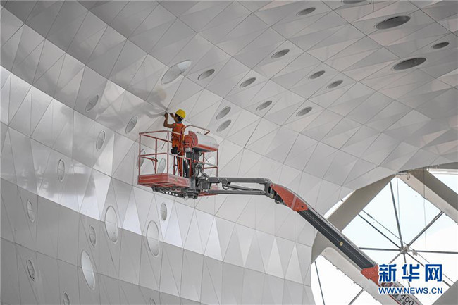 8月25日,工人在位于??诘暮D蠂H會展中心二期項(xiàng)目施工。新華社記者 蒲曉旭 攝
