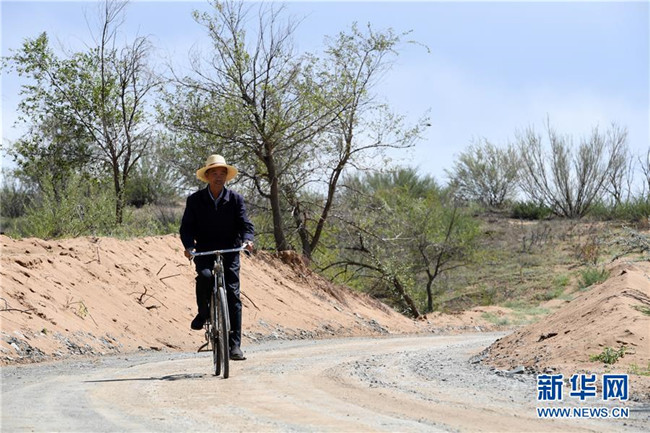 在古浪縣八步沙林場(chǎng),場(chǎng)長(zhǎng)郭萬(wàn)剛騎著自行車(chē)巡護(hù)林場(chǎng)(9月1日攝)。 新華社記者 范培珅 攝