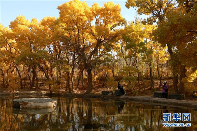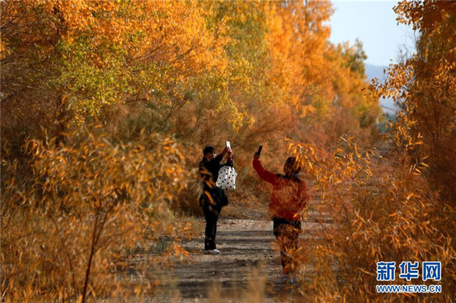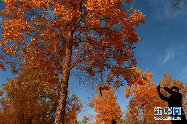 10月10日,游客在甘肅省敦煌市莫高鎮(zhèn)的胡楊林中拍照。 金秋十月,甘肅省敦煌市莫高鎮(zhèn)的胡楊林盡染秋色,美不勝收。 新華社發(fā)(張曉亮 攝)