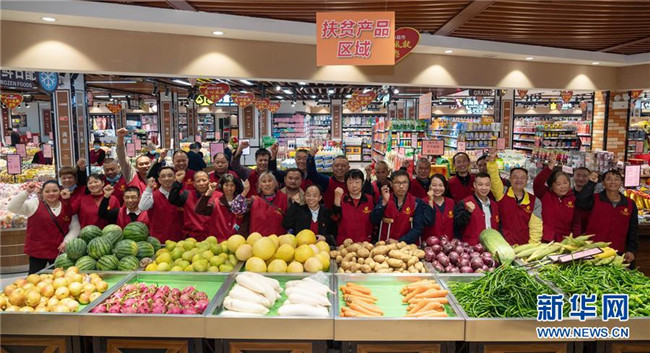 10月14日,在湖南省邵陽市隆回縣都來連鎖超市,殘疾人羅龍桂(前排中)與殘疾員工們合影。羅龍桂修過多年鐘表電器,后來開辦連鎖超市,成為一名企業(yè)家,他的企業(yè)先后幫助200余名殘疾人和120余戶貧困家庭脫貧。