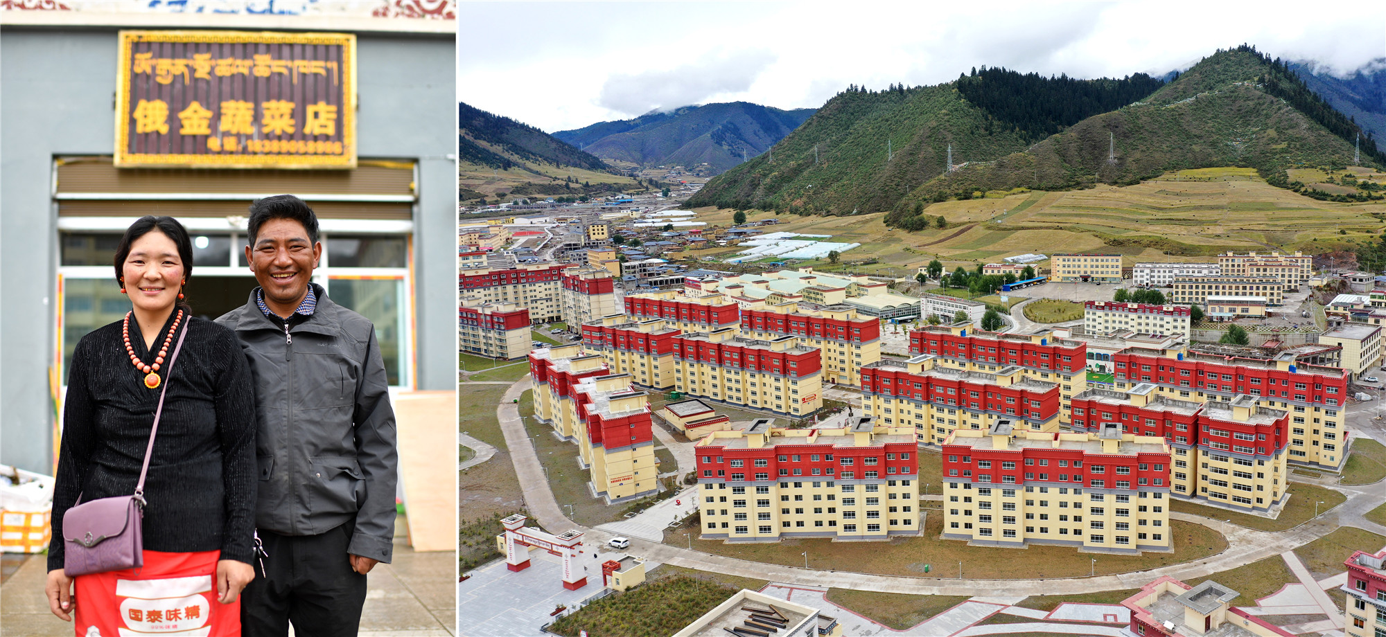 2020年9月22日拍攝的拼版照片:左圖為西藏自治區(qū)昌都市類烏齊縣長毛嶺鄉(xiāng)達雄村村民俄金(右)和妻子阿丁在安置點俄金蔬菜店前;右圖為類烏齊縣桑多扶貧開發(fā)區(qū)易地扶貧搬遷安置點一角(無人機照片)。新華社記者 詹彥 攝