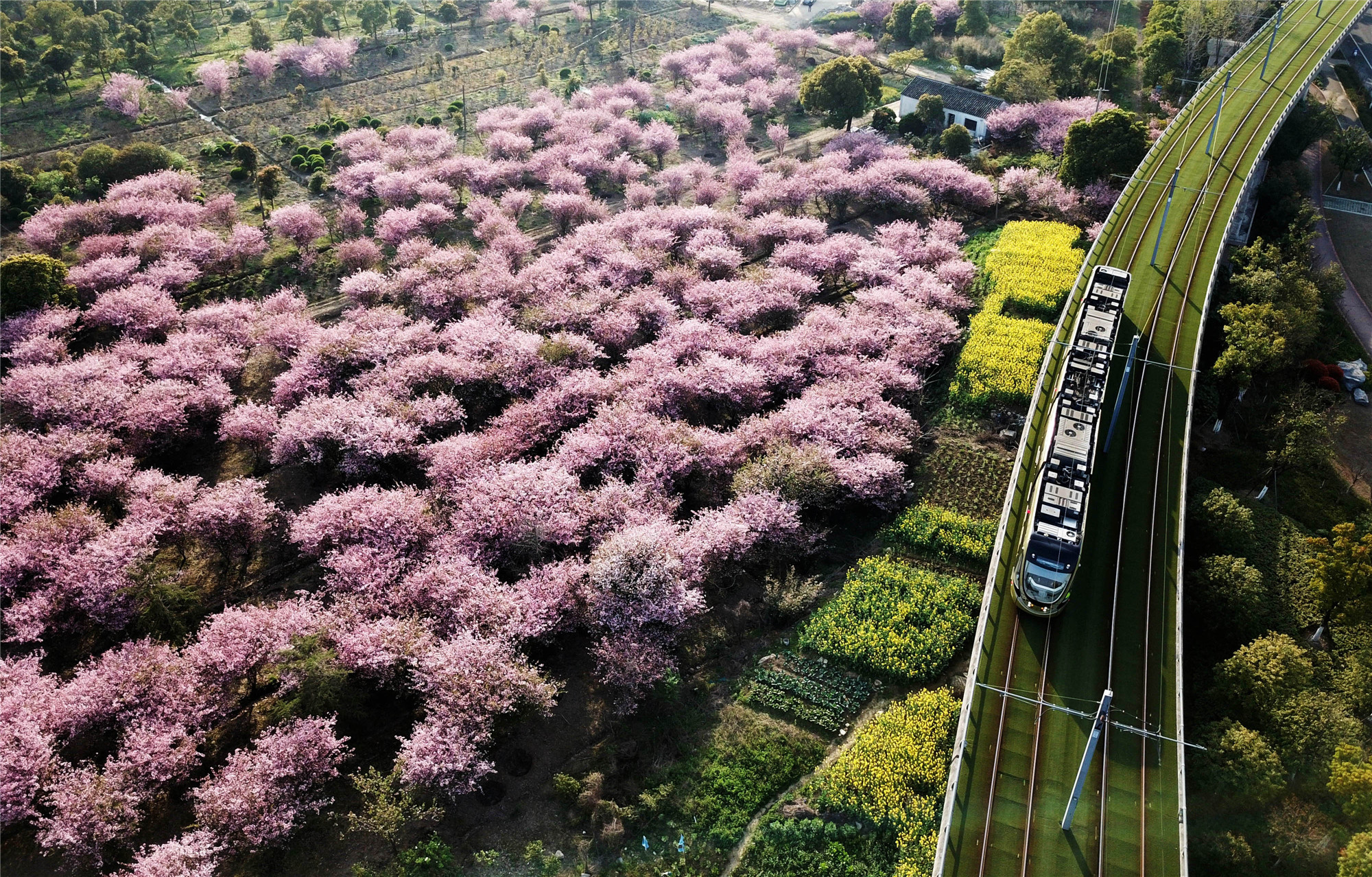 在江蘇蘇州高新區(qū),一輛有軌電車從一片盛開的垂絲海棠旁駛過(2018年3月28日攝)。新華社發(fā)(徐志強 攝)