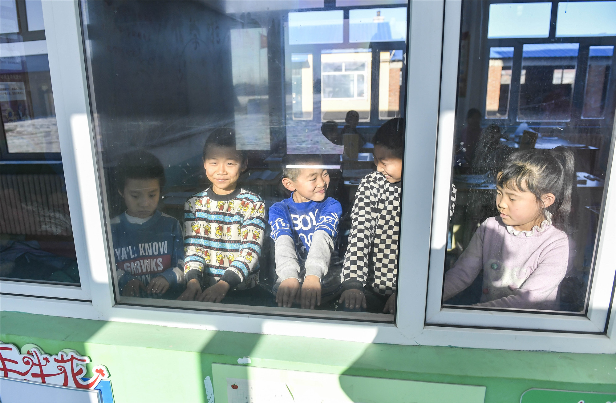 吉林省德惠市邊崗鄉(xiāng)臥虎村小學(xué)學(xué)生在戶外活動后圍著教室內(nèi)的環(huán)流散熱器取暖(2018年12月26日攝)。新華社記者 許暢 攝