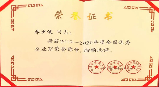 12月1日,以“弘揚優(yōu)秀企業(yè)家精神,勇于創(chuàng)新?lián)敺瞰I”為主題的“2020年全國企業(yè)家活動日暨中國企業(yè)家年會”在廣東省東莞市舉行。會上表彰了154名優(yōu)秀企業(yè)家,公司董事長、總經(jīng)理喬少波喜獲“2019-2020年全國優(yōu)秀企業(yè)家”稱號。