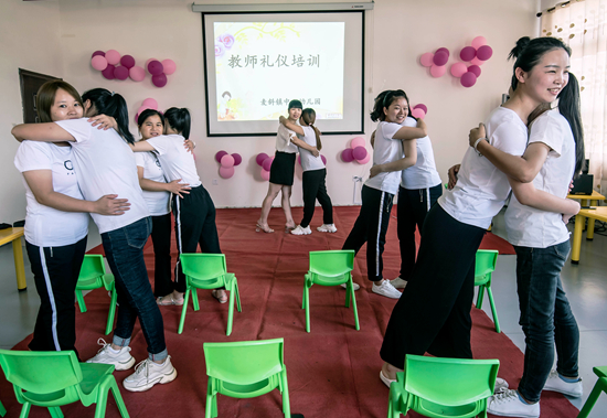 9月9日,江西省吉安市新干縣麥鎮(zhèn)中心幼兒園支教老師鄒小琳(左五)正在對(duì)該園幼教老師進(jìn)行禮儀培訓(xùn)。視覺(jué)中國(guó)供圖