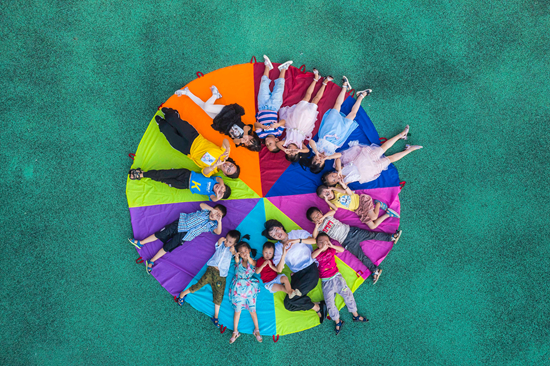 9月9日,江西省吉安市新干縣城上鄉(xiāng)中心幼兒園支教幼師敖敏慧(黃衣服)和劉智秀(白衣服)正在指導(dǎo)該園幼兒開(kāi)展降落傘游戲。視覺(jué)中國(guó)供圖