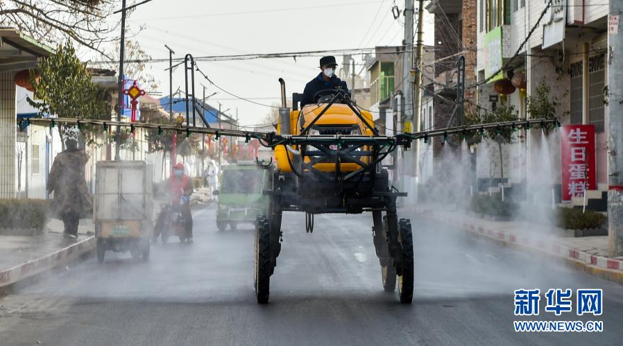 1月15日,在河北省石家莊市藁城區(qū)禪房村,防疫工作人員使用農(nóng)用噴霧機進行消殺。新華社發(fā)(趙杰 攝)
