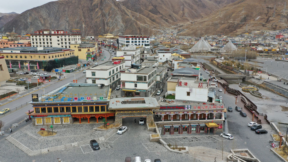 ↑ 圖為2021年3月10日拍攝的玉樹市一處商業(yè)區(qū)(地震前為結(jié)古寺賓館)。