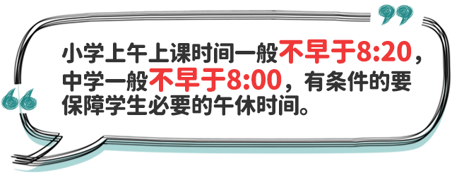 三、統(tǒng)籌安排學(xué)校作息時間。省級教育行政部門要從保證學(xué)生充足睡眠需要出發(fā),結(jié)合實際情況合理確定中小學(xué)作息時間。小學(xué)上午上課時間一般不早于8:20,中學(xué)一般不早于8:00;學(xué)校不得要求學(xué)生提前到校參加統(tǒng)一的教育教學(xué)活動,對于個別因家庭特殊情況提前到校學(xué)生,學(xué)校應(yīng)提前開門、妥善安置;合理安排課間休息和下午上課時間,有條件的地方和學(xué)校應(yīng)保障學(xué)生必要的午休時間;寄宿制學(xué)校要合理安排作息時間,確保學(xué)生達(dá)到規(guī)定睡眠時間要求。