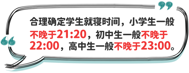 二、明確學(xué)生睡眠時間要求。根據(jù)不同年齡段學(xué)生身心發(fā)展特點,小學(xué)生每天睡眠時間應(yīng)達(dá)到10小時,初中生應(yīng)達(dá)到9小時,高中生應(yīng)達(dá)到8小時。學(xué)校、家庭及有關(guān)方面應(yīng)共同努力,確保中小學(xué)生充足睡眠時間。
