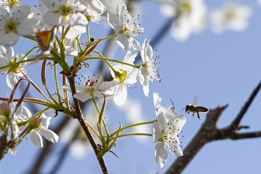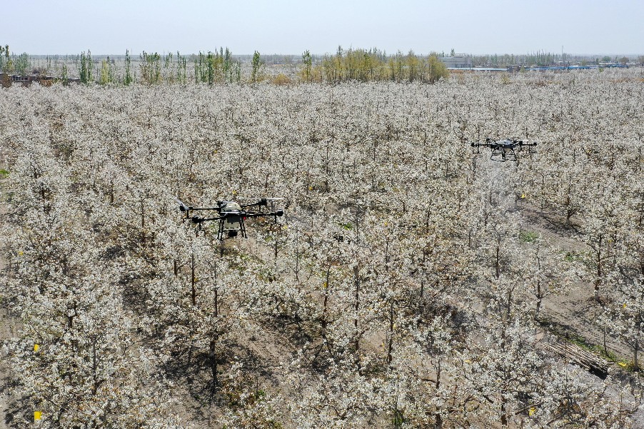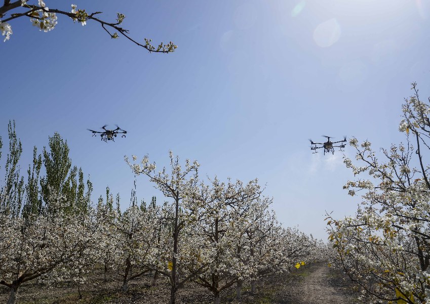 在新疆南疆等地,梨樹花期很短,且往往伴隨沙塵天氣,梨樹授粉作為梨產(chǎn)業(yè)發(fā)展中最為關(guān)鍵的一環(huán),以往通過人工授粉或者蜜蜂授粉進行。隨著人工成本不斷增加以及產(chǎn)業(yè)健康發(fā)展需要,以蜜蜂采集的高活性授粉用花粉聯(lián)合無人機噴施的蜂機協(xié)同作業(yè)高效液體授粉技術(shù)開始出現(xiàn)。