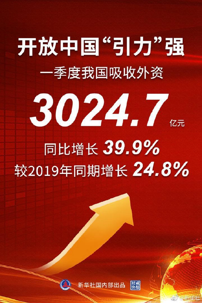 商務部15日發(fā)布數(shù)據(jù)顯示,一季度,我國新設外商投資企業(yè)10263家,同比增長47.8%;實際使用外資金額3024.7億元,同比增長39.9%。