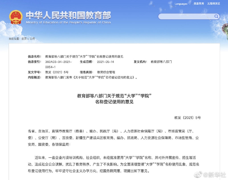 教育部等八部門(mén)近日印發(fā)意見(jiàn),規(guī)范大學(xué)學(xué)院名稱登記使用。教育部表示,一些企業(yè)內(nèi)設(shè)培訓(xùn)機(jī)構(gòu)、社會(huì)組織,未經(jīng)批準(zhǔn)冒用“大學(xué)”“學(xué)院”名稱,并對(duì)外開(kāi)展宣傳、招生等活動(dòng),造成社會(huì)公眾誤解,擾亂了教育秩序。意見(jiàn)明確,“大學(xué)”“學(xué)院”名稱經(jīng)審批方可使用。大學(xué)由國(guó)務(wù)院教育行政部門(mén)依法審批或備案;學(xué)院根據(jù)辦學(xué)層次、類型、法人性質(zhì)等,由中央和國(guó)家有關(guān)部門(mén)或省級(jí)人民政府及其有關(guān)部門(mén)依法審批。涉及機(jī)構(gòu)編制事項(xiàng)的,按照機(jī)構(gòu)編制管理權(quán)限和規(guī)定程序,報(bào)機(jī)構(gòu)編制部門(mén)審批。(記者胡浩)