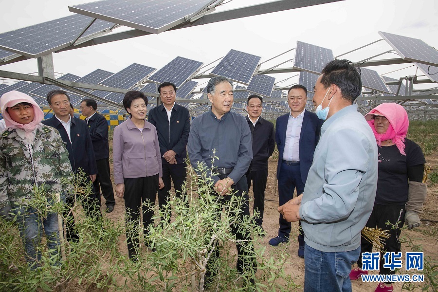 5月17日至19日,中共中央政治局常委、全國政協(xié)主席汪洋在寧夏調(diào)研。這是18日,汪洋在寶豐農(nóng)光一體化項(xiàng)目基地同工作人員親切交談。新華社記者 李濤 攝