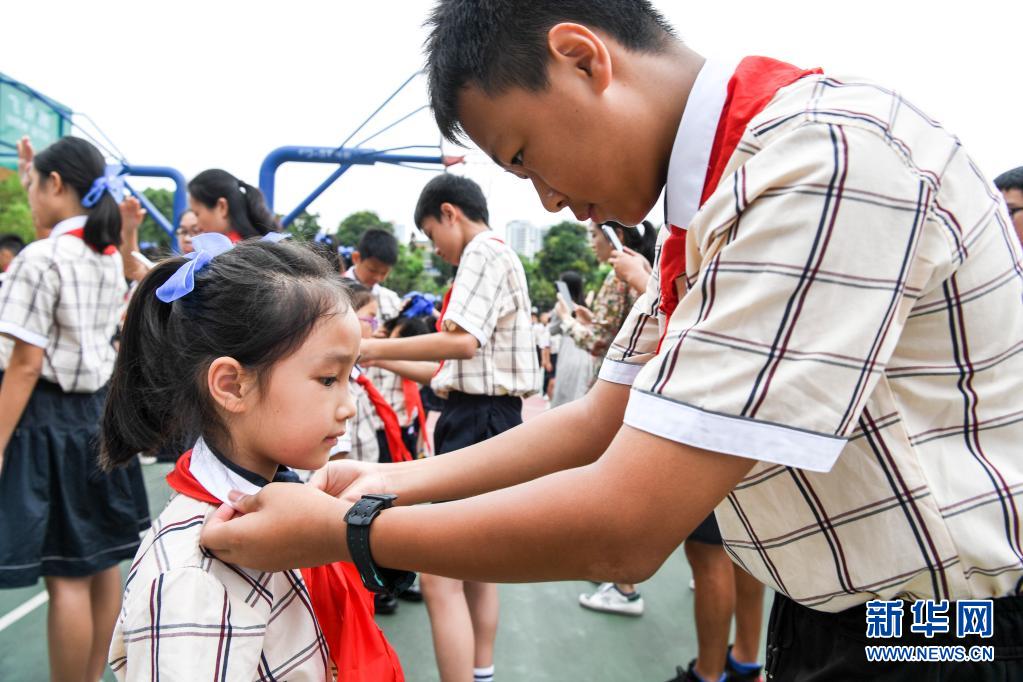 5月31日,南寧市濱湖路小學(xué)高年級的少先隊(duì)員在入隊(duì)儀式上為新入隊(duì)的同學(xué)系紅領(lǐng)巾。新華社記者 曹祎銘 攝