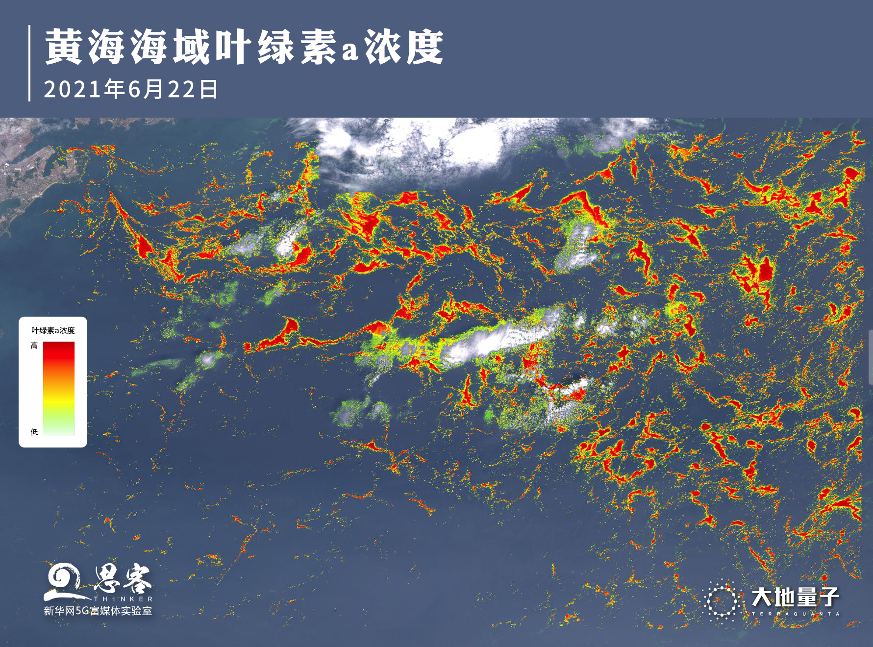 ▲基于遙感影像反演技術(shù)得到的黃海海域葉綠色a濃度遙感分析,由此可推出滸苔生長較旺盛。制圖:大地量子