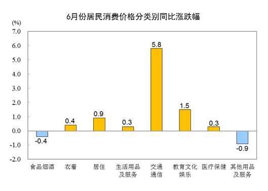 6月份,全國居民消費價格環(huán)比下降0.4%。其中,城市下降0.4%,農(nóng)村下降0.5%;食品價格下降2.2%,非食品價格持平;消費品價格下降0.6%,服務價格下降0.1%。