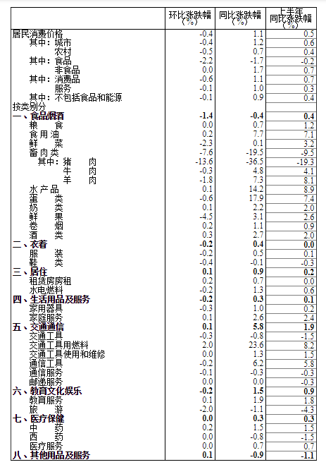 其他七大類價格同比六漲一降。其中,交通通信、教育文化娛樂、居住價格分別上漲5.8%、1.5%和0.9%,衣著、生活用品及服務、醫(yī)療保健價格分別上漲0.4%、0.3%和0.3%;其他用品及服務價格下降0.9%。