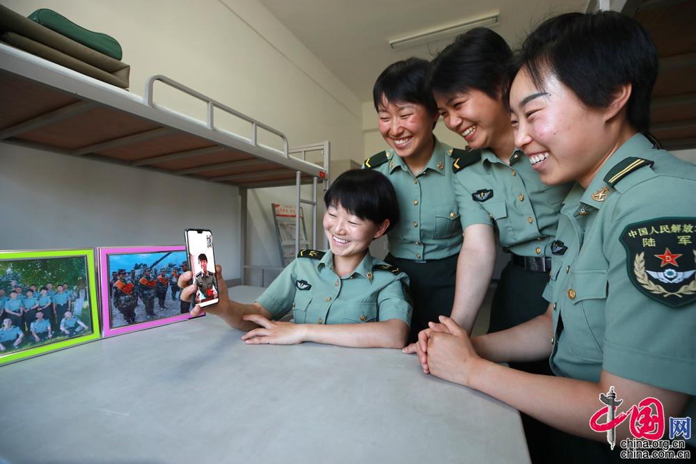 全國“兩會”期間,全國人大代表馬和帕麗與女子坦克班視頻連線,介紹參會情況。袁凱 攝