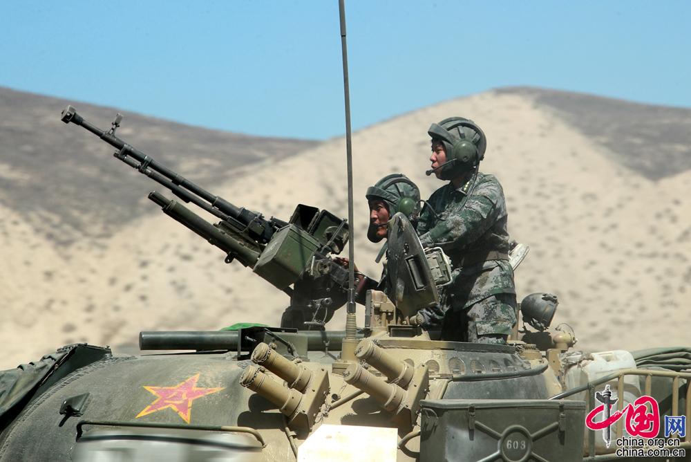 新疆軍區(qū)某合成團(tuán)坦克二連政治指導(dǎo)員馬和帕麗(右一)組織戰(zhàn)術(shù)訓(xùn)練的情景。袁凱 攝