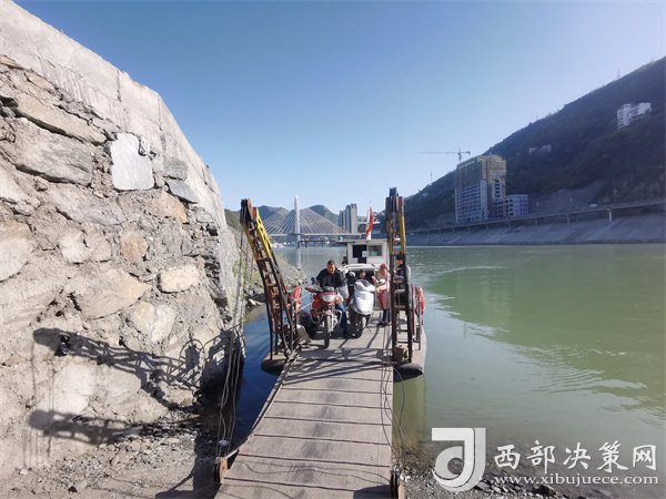 大橋通車(chē)前坐渡船過(guò)江的居民和遠(yuǎn)處的大橋