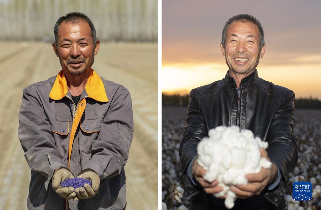 拼版照片:左圖為春播時節(jié),陸高林手捧棉種站在三道溝村的棉田里(4月15日攝);右圖為秋收時節(jié),陸高林手捧棉花站在三道溝村的棉田里(10月23日攝)。新華社記者 胡虎虎 攝