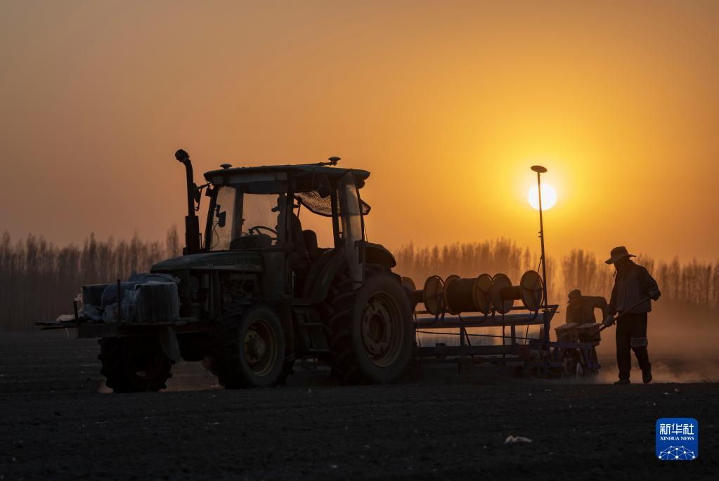 春播時節(jié),陸德文駕駛采棉機在棉田播種,兩名工人在車后跟隨保障,隨時進行壓地膜、補充棉種和處理故障等作業(yè)(4月14日攝)。新華社記者 胡虎虎 攝