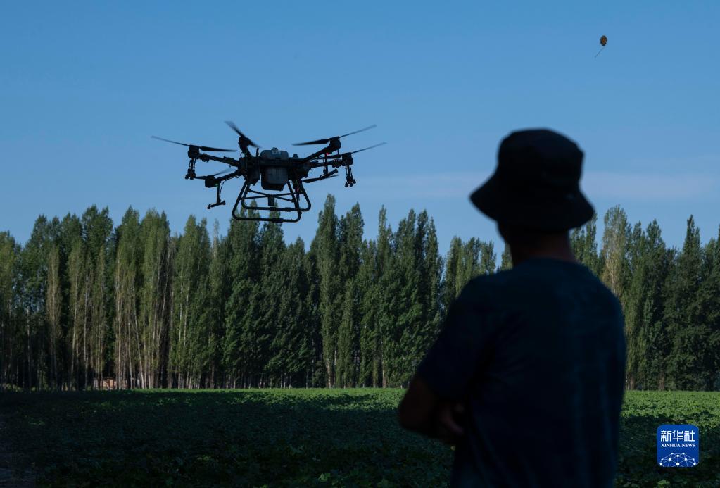盛夏田間管理期間,農(nóng)業(yè)植保無人機在棉田噴灑農(nóng)藥,陸高林在一旁觀看(7月15日攝)。今年老陸家第一次雇人使用無人機進行飛防作業(yè),以往都是開拖拉機進棉田打藥。新華社記者 胡虎虎 攝
