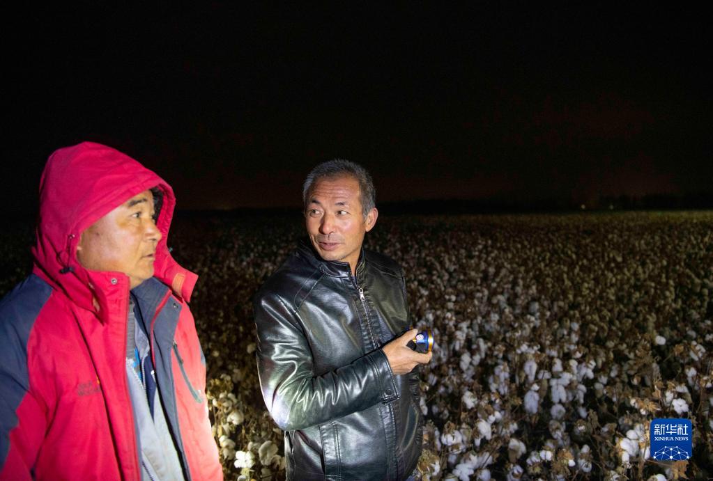 在新疆塔城地區(qū)沙灣市大泉鄉(xiāng)三道溝村,夜幕降臨后,陸高林(右)在等待采棉機轉(zhuǎn)場,并與采棉機老板商量棉花采收進展(10月22日攝)。新華社記者 胡虎虎 攝