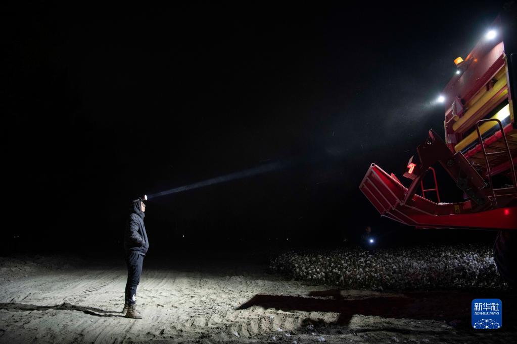 夜幕降臨,陸德文在棉田里守候采棉機轉(zhuǎn)場(10月22日攝)。新華社記者 胡虎虎 攝