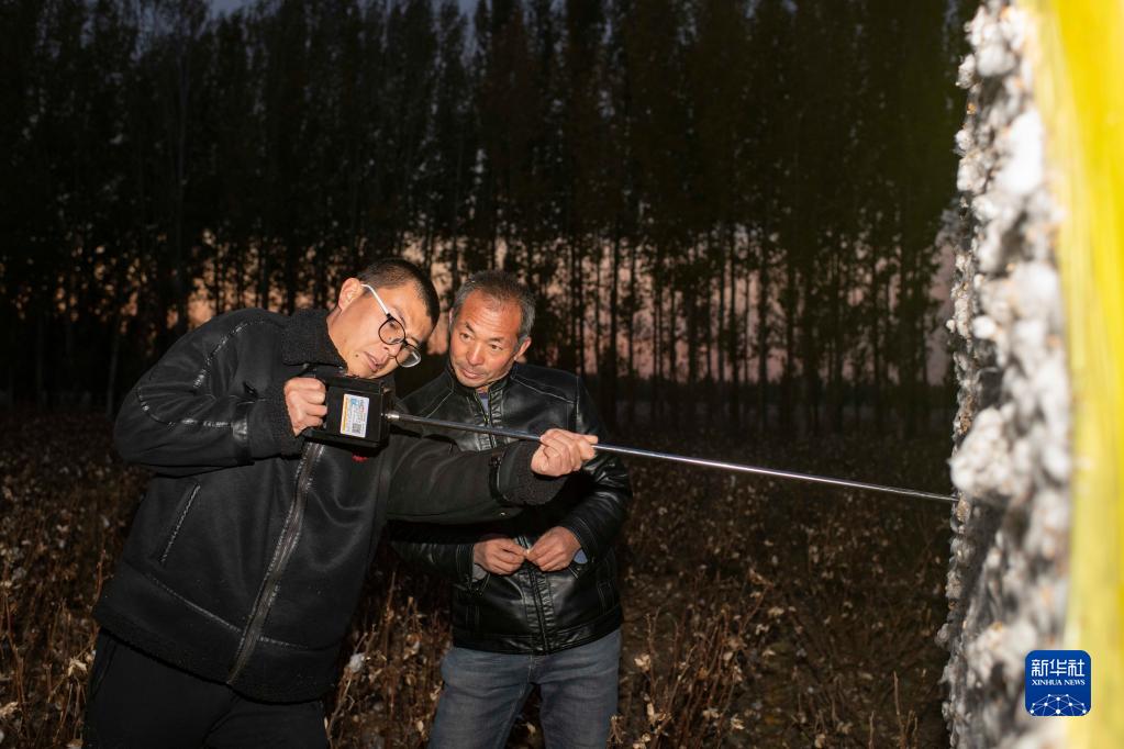 在新疆塔城地區(qū)沙灣市大泉鄉(xiāng)三道溝村,陸高林(右)和兒子陸德文使用儀器檢測已采收棉花的濕度(10月23日攝)。棉花售賣時,軋花廠會對棉包進行質(zhì)量抽測,濕度過高會影響價格。新華社記者 胡虎虎 攝