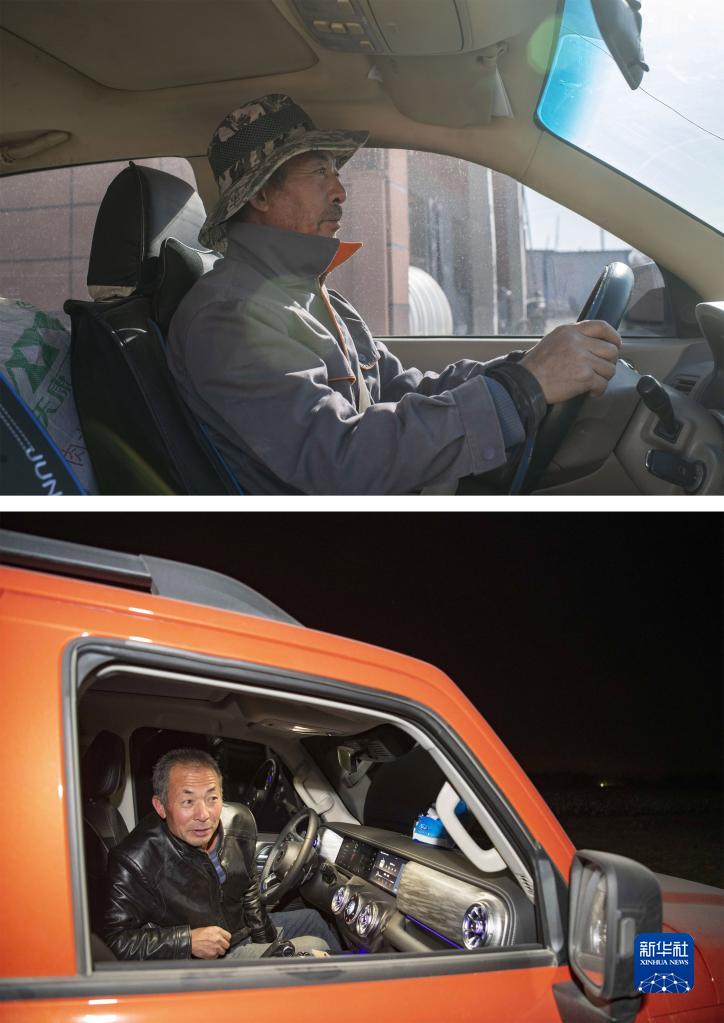 拼版照片:上圖為春播時節(jié),陸高林開車載著農(nóng)資去棉田干活(4月15日攝);下圖為秋收時節(jié),陸高林在新?lián)Q的越野車內(nèi)等候采棉機轉(zhuǎn)場(10月22日攝)。新華社記者 胡虎虎 攝