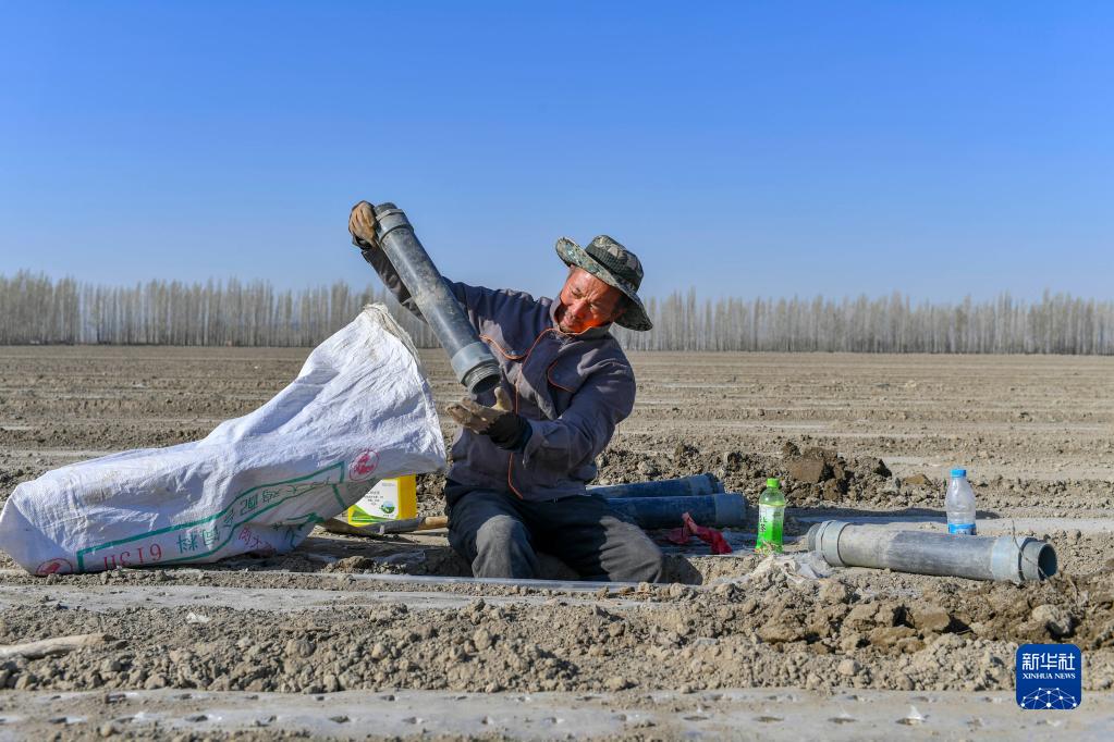陸高林在一片已播種的棉地里清理滴管管道設(shè)備,為出苗時的水肥供給做準備(4月15日攝)。新華社記者 胡虎虎 攝