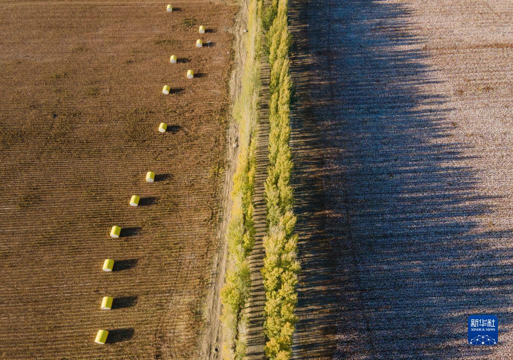 這是在新疆塔城地區(qū)沙灣市大泉鄉(xiāng)三道溝村拍攝的陸高林家的棉田(10月24日攝,無人機照片)。畫面左側(cè)為已采收的棉田,棉包擺放在地上,待價格合適時,這些棉包將被運往軋花廠售賣;右側(cè)為待采收的地塊。新華社記者 胡虎虎 攝