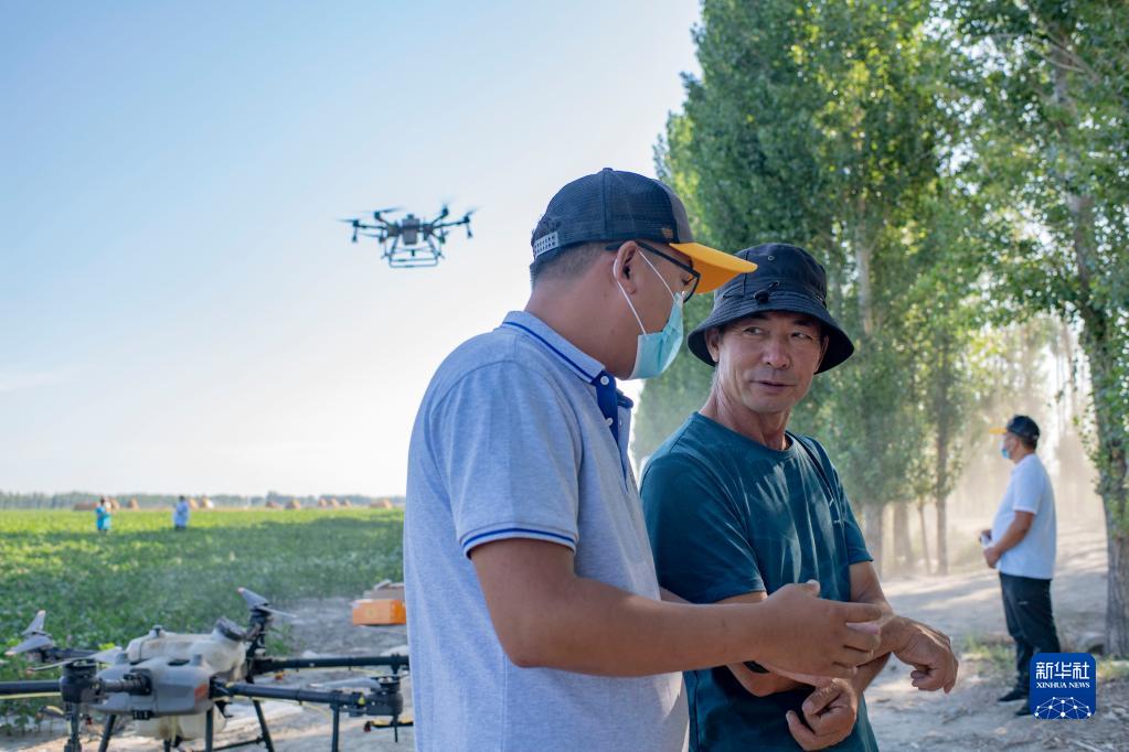 盛夏田間管理期間,陸高林(右)和沙灣市一家農(nóng)業(yè)服務(wù)團隊負責人王福珖在棉田里談?wù)撧r(nóng)業(yè)植保無人機作業(yè)特點(7月15日攝)。新華社記者 胡虎虎 攝