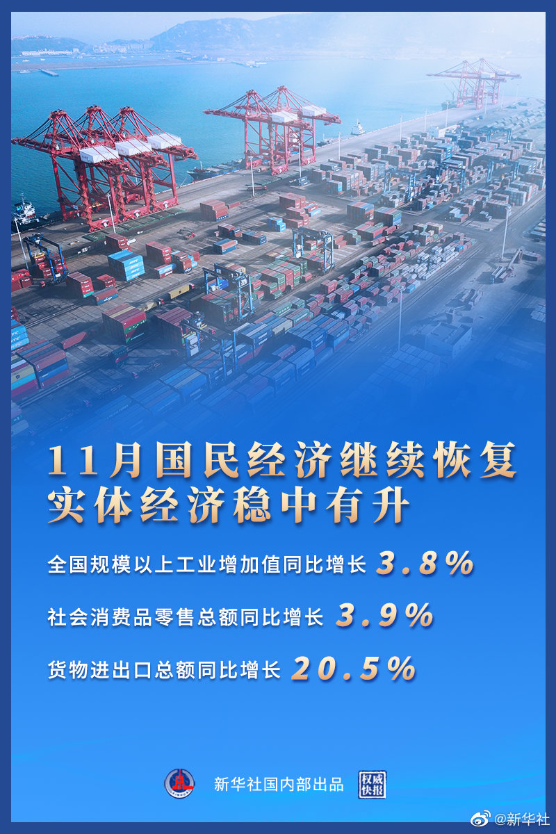 國家統(tǒng)計(jì)局15日發(fā)布的數(shù)據(jù)顯示,11月份,全國規(guī)模以上工業(yè)增加值同比增長3.8%,兩年平均增長5.4%;社會消費(fèi)品零售總額41043億元,同比增長3.9%,兩年平均增長4.4%;貨物進(jìn)出口總額37164億元,同比增長20.5%。國民經(jīng)濟(jì)繼續(xù)保持恢復(fù)態(tài)勢,發(fā)展韌性不斷增強(qiáng)。(記者魏玉坤、鄒多為,海報(bào)設(shè)計(jì)楊軼群)