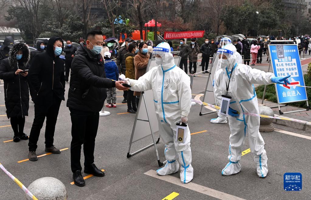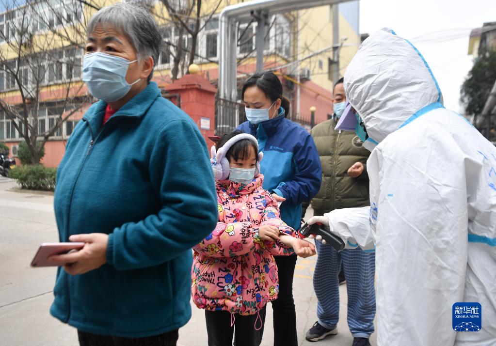 12月23日,西安市蓮湖區(qū)一處社區(qū),工作人員為接受核酸檢測的居民測溫。新華社記者 張博文 攝