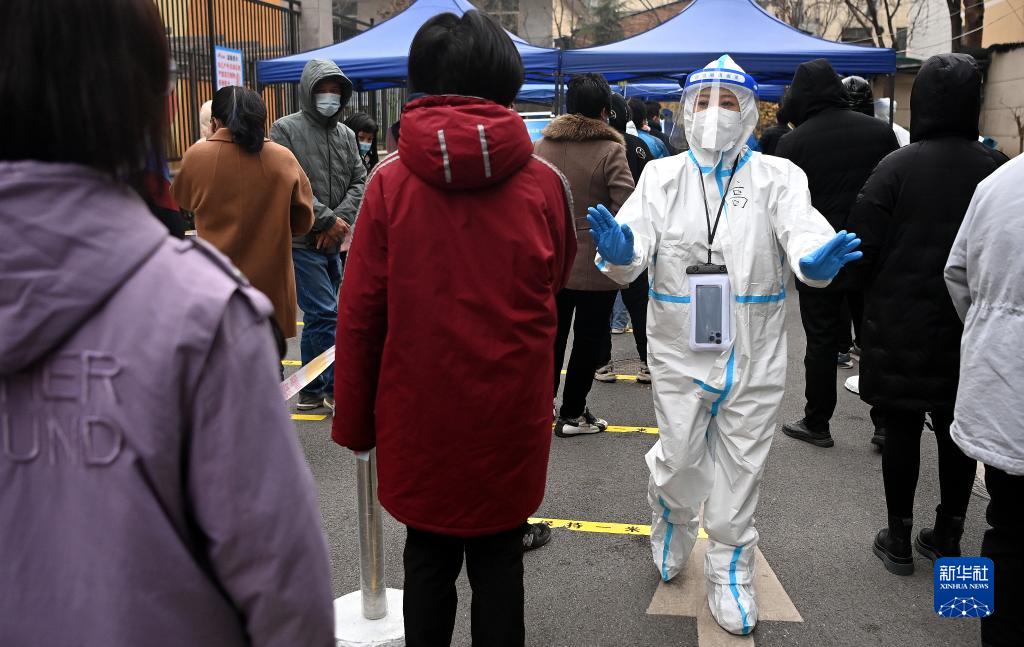 12月23日,西安市新城區(qū)一小區(qū),核酸檢測人員維持秩序。新華社記者 劉瀟 攝