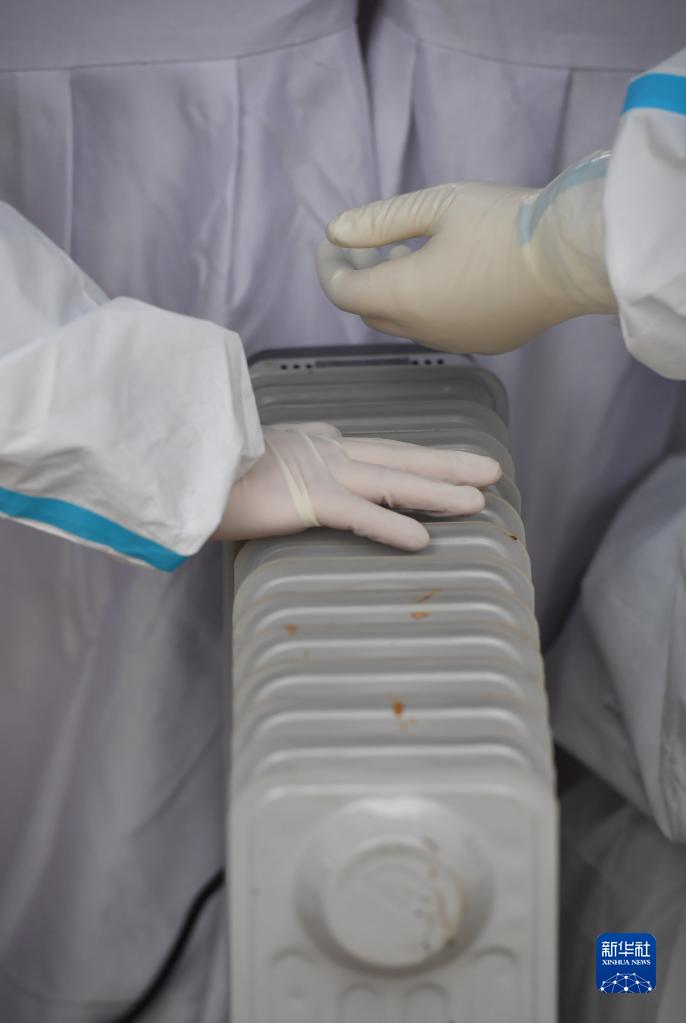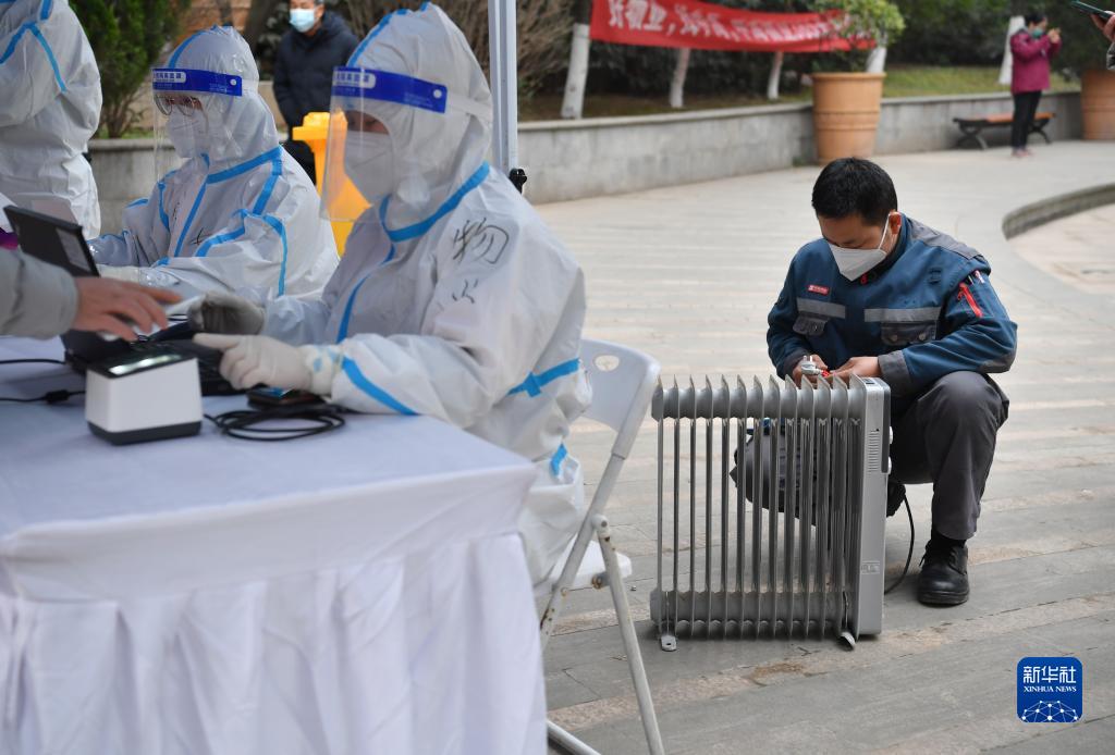 12月23日,在西安一小區(qū),物業(yè)人員為核酸檢測點的工作人員安裝電暖器。新華社記者 邵瑞 攝
