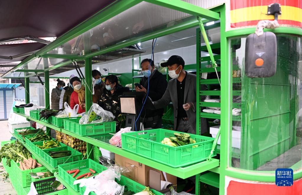 12月23日,西安市曲江新區(qū)一小區(qū)引入蔬菜大棚車,住戶在小區(qū)內買菜。新華社記者 劉瀟 攝