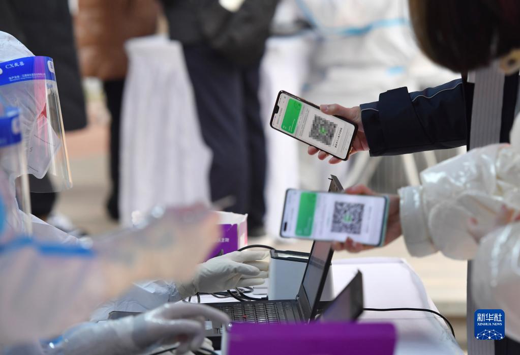 12月23日,在西安一小區(qū),居民掃碼進行核酸檢測。新華社記者 邵瑞 攝